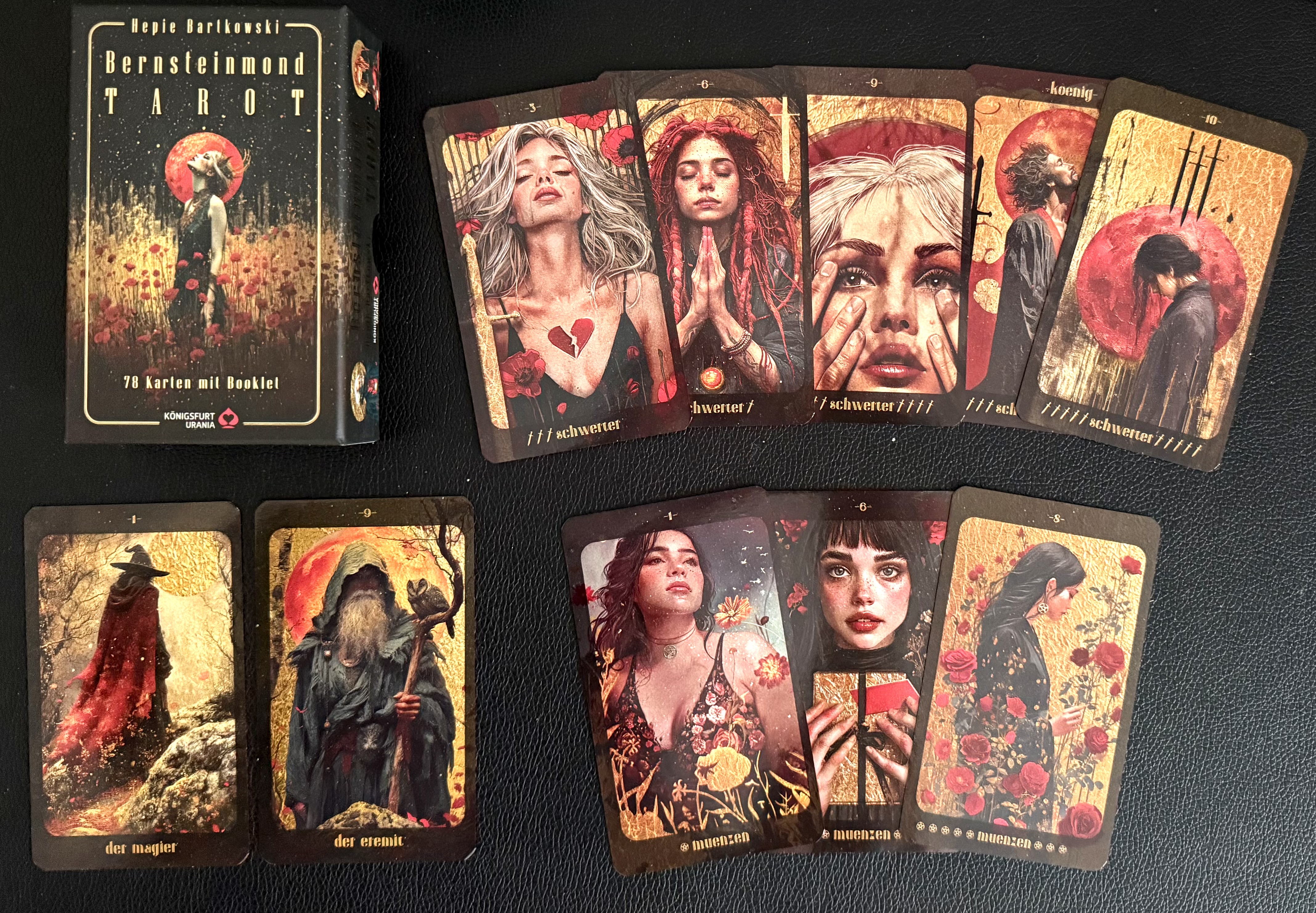 Das Bernsteinmond Tarot von Hepie Bartkowski, erschienen im Oktober 2025 bei Königsfurt-Urania, umfasst 78 Karten mit Begleitbooklet. Das Deck präsentiert sich als ruhiges, stark atmosphärisches Tarot, dessen herbstlicher Charakter sofort spürbar ist.